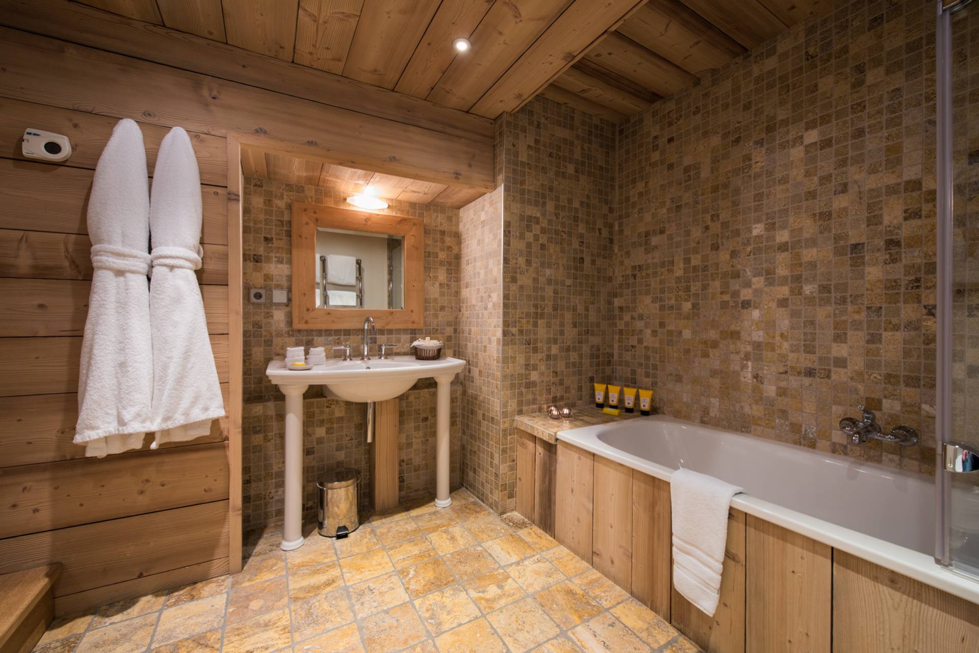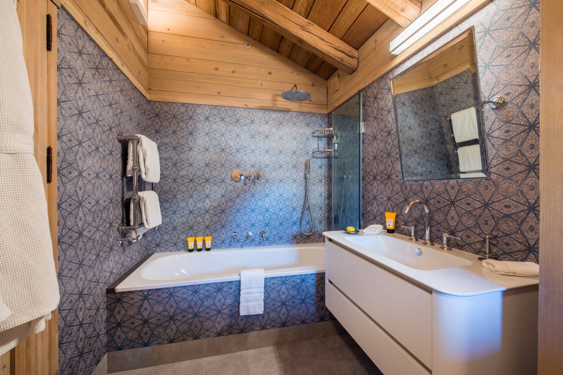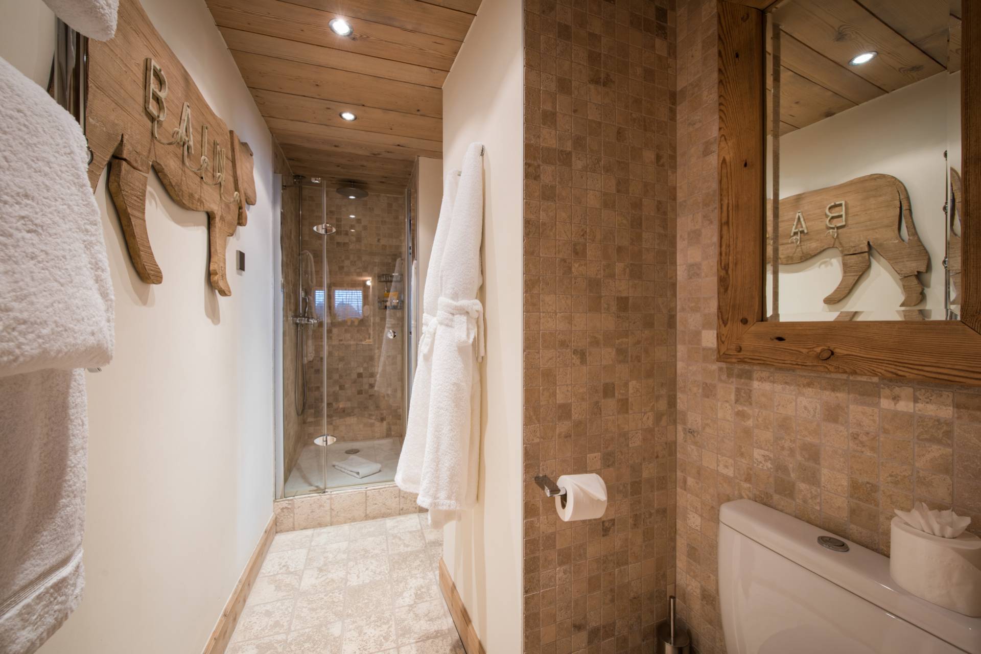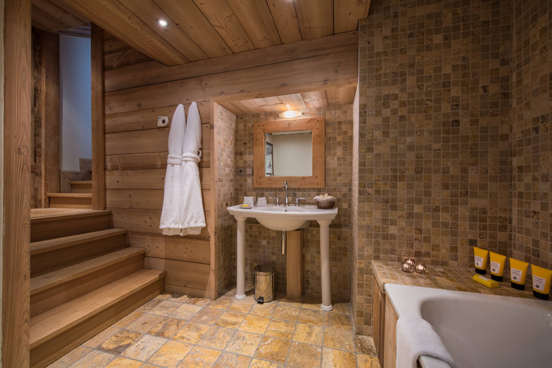 In the heart of the chalet, you can relax in the double lounge on the ground floor. On one side, you can enjoy the magnificent fireplace set into the stone wall as well as the remarkable height of the ceiling, dominated by a mezzanine leading to the upper floor. On the other side, you can chat with friends, comfortably seated in beautiful designer sofas and armchairs, while sipping drinks. In this vast open space, the atmosphere is comfortable and cozy, and the lighting is warm and sophisticated. The room is decorated with contemporary works of art carefully selected by the owners. On this level, you will still find two beautiful, large bedrooms with private bathrooms, designed to offer you the luxury of a spa.