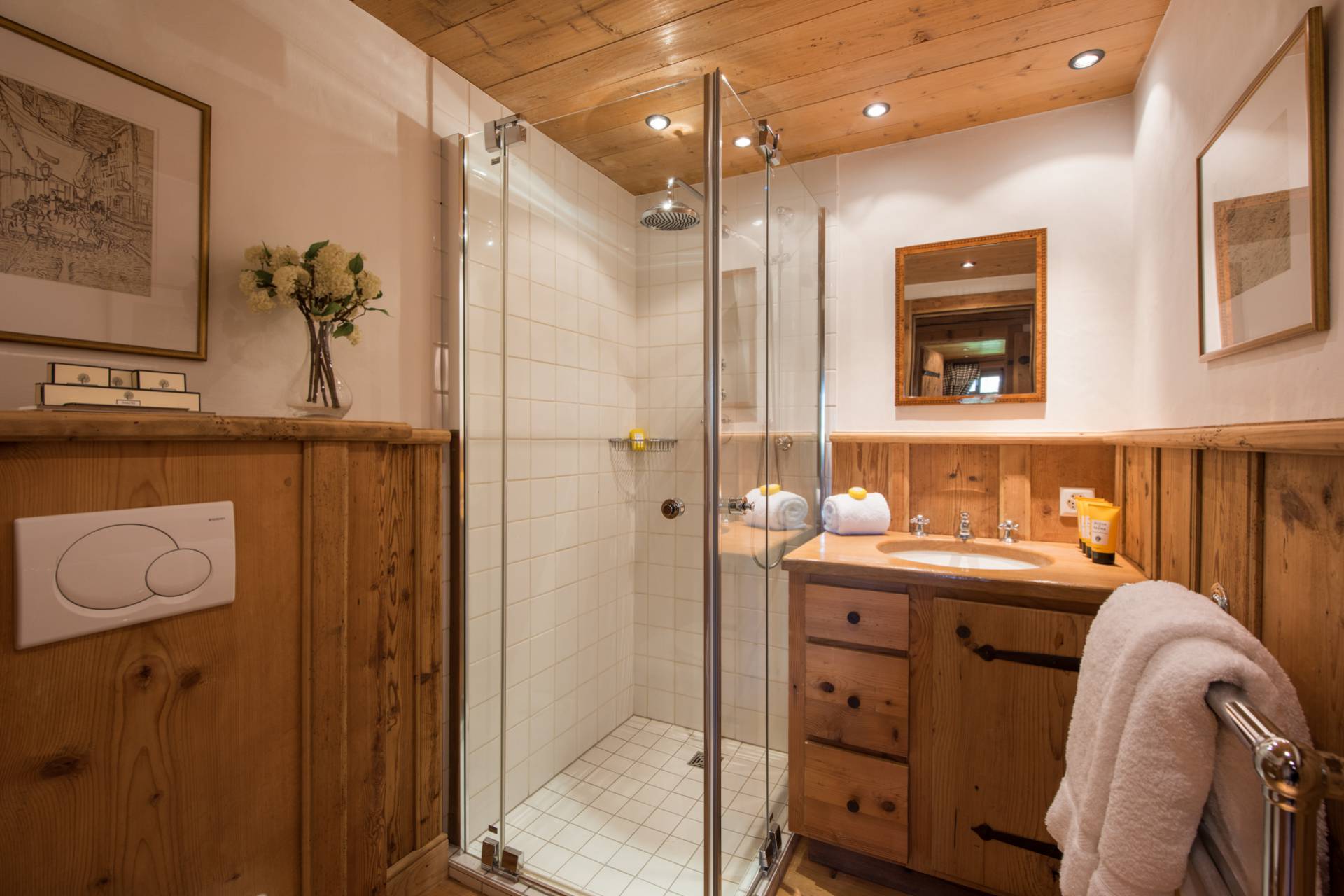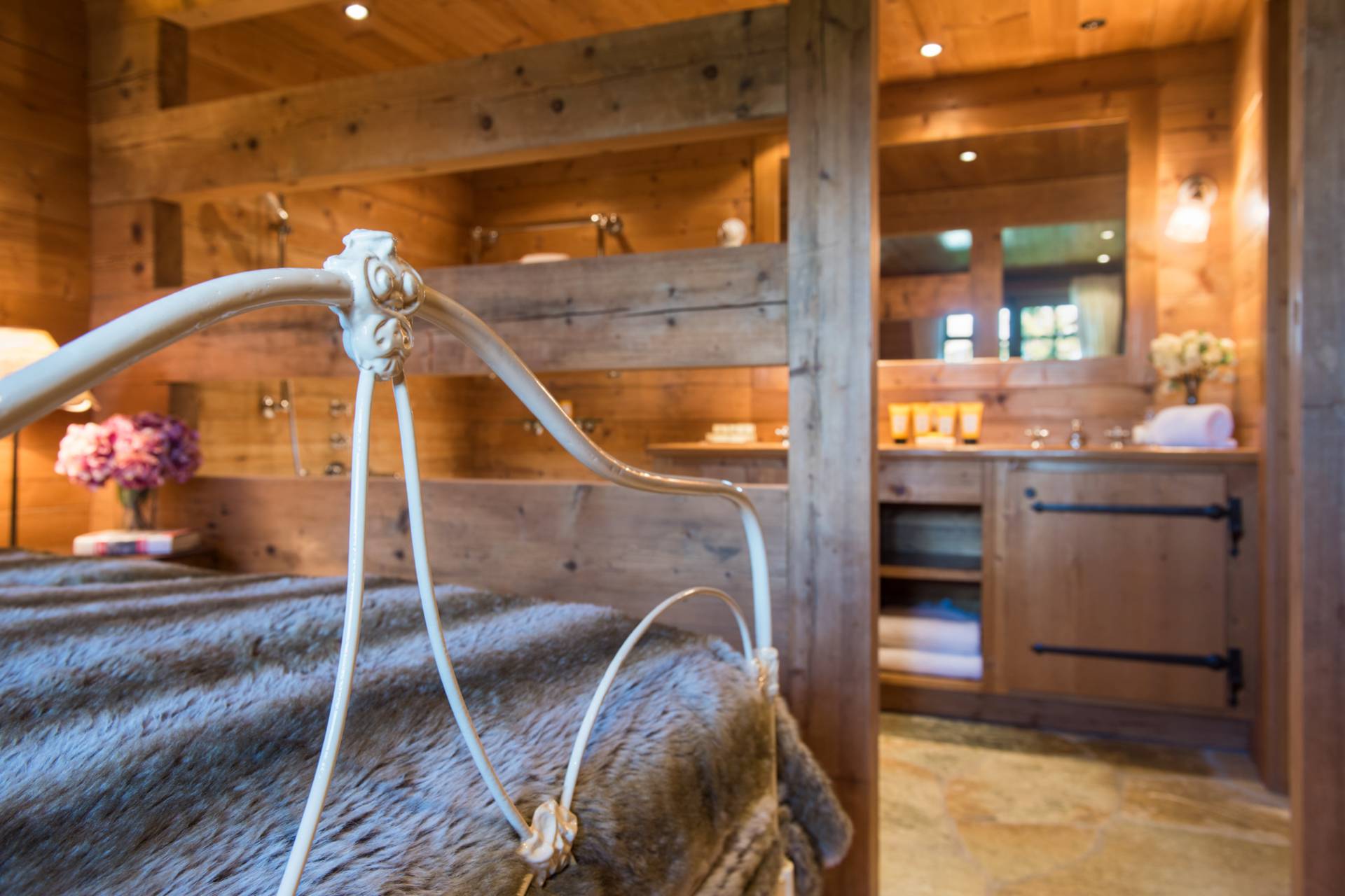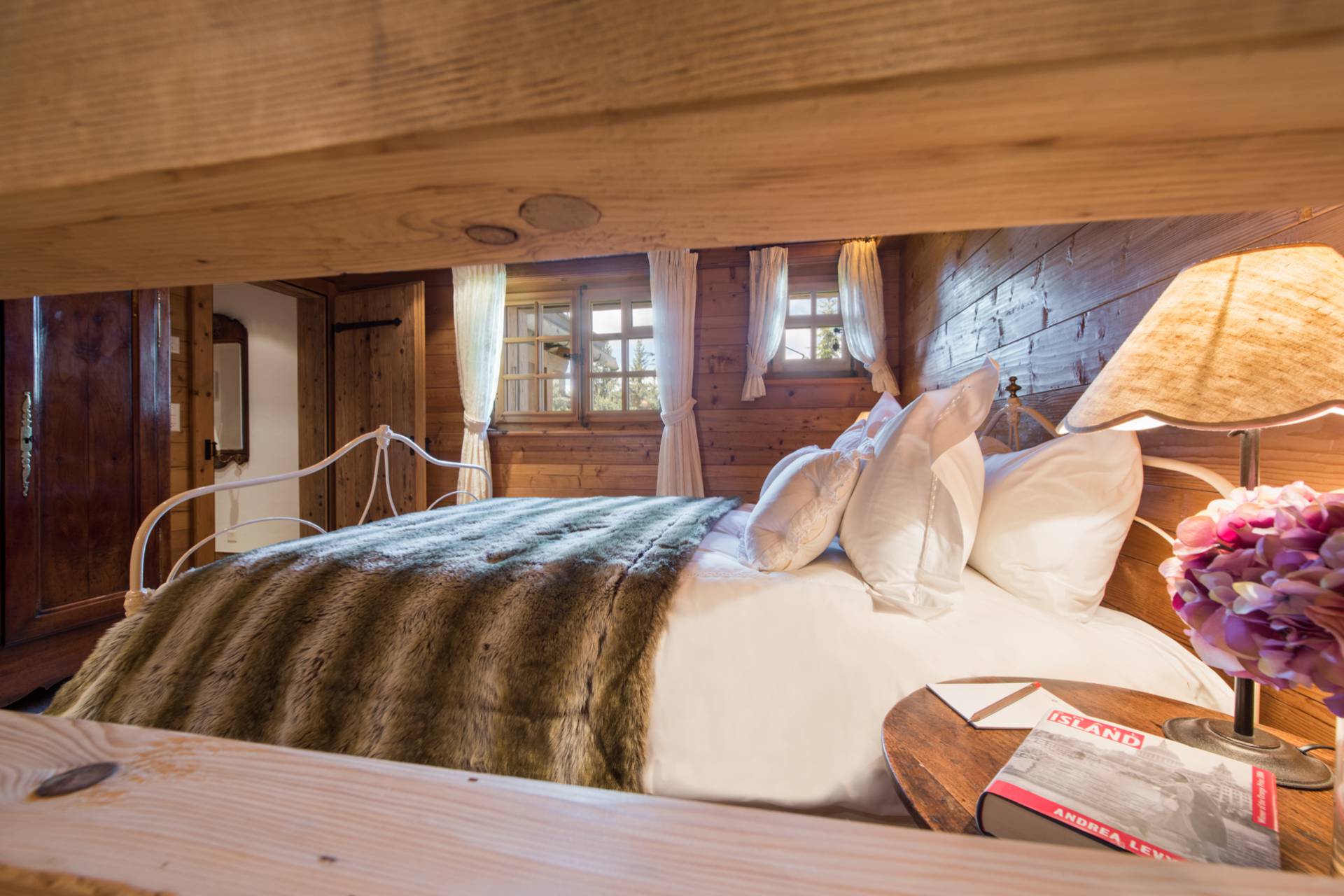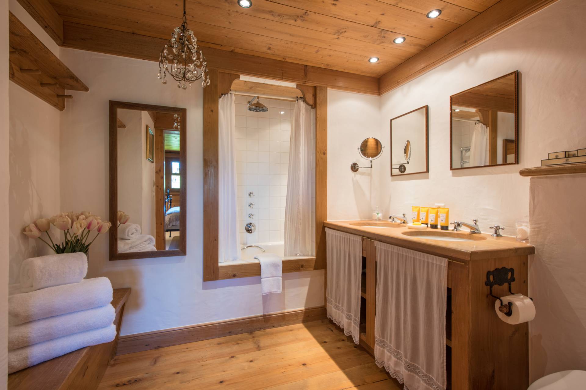 The three main bedrooms are on the first floor of the chalet. Its decoration respects alpine tradition, making you feel like you have stepped into the past. The walls with wooden cladding and stone paving dialogue in harmony with the antique furniture and wrought iron beds. The atmosphere of each of the rooms is simple and elegant. Two of them are double and equipped with king size beds with private bathrooms with foot tubs and antique faience tiles. The third is for children, with four bunk beds and an en-suite shower room. The architects were pleased to restore the house’s authentic character, multiplying the charming details, choosing finely embroidered veilings, rustic ironwork, and old engravings to decorate the walls. Perched in the mezzanine, a last room equipped with two extra beds can also accommodate two other people who can then enjoy the independent bathroom on the ground floor.