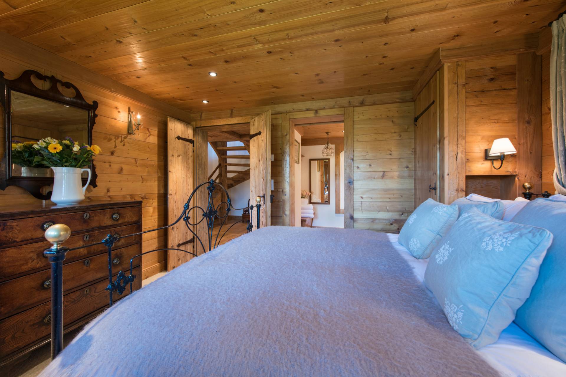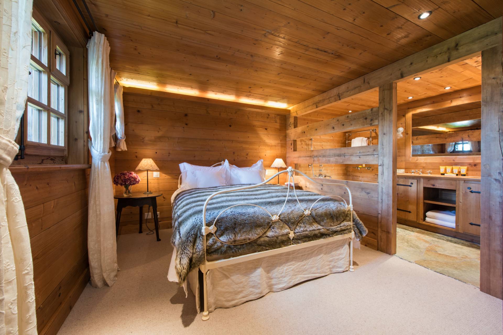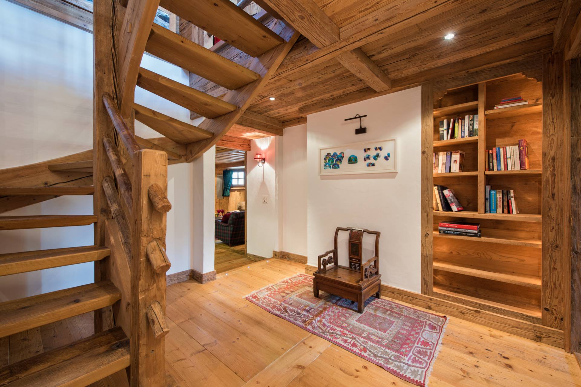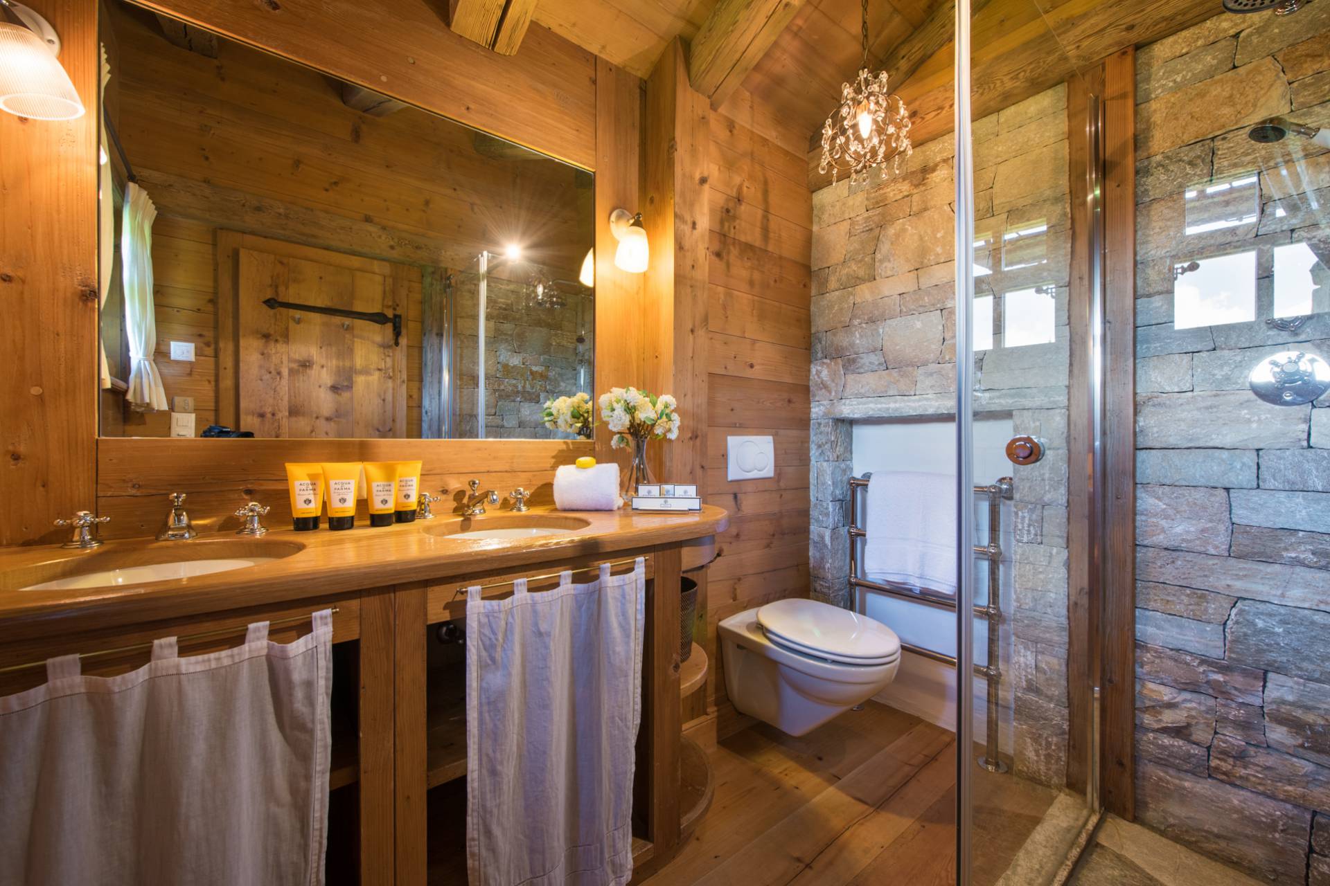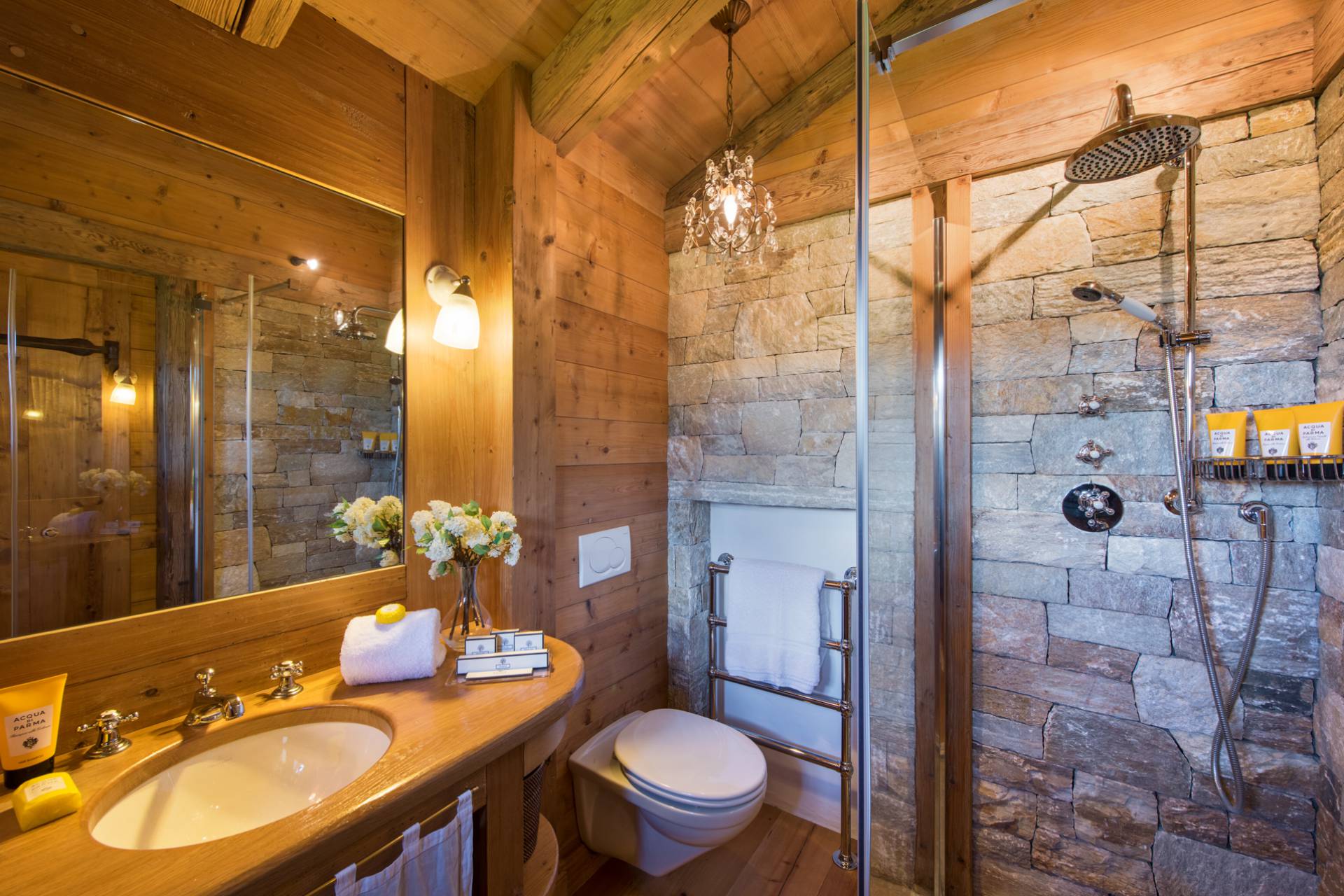 The three main bedrooms are on the first floor of the chalet. Its decoration respects alpine tradition, making you feel like you have stepped into the past. The walls with wooden cladding and stone paving dialogue in harmony with the antique furniture and wrought iron beds. The atmosphere of each of the rooms is simple and elegant. Two of them are double and equipped with king size beds with private bathrooms with foot tubs and antique faience tiles. The third is for children, with four bunk beds and an en-suite shower room. The architects were pleased to restore the house’s authentic character, multiplying the charming details, choosing finely embroidered veilings, rustic ironwork, and old engravings to decorate the walls. Perched in the mezzanine, a last room equipped with two extra beds can also accommodate two other people who can then enjoy the independent bathroom on the ground floor.