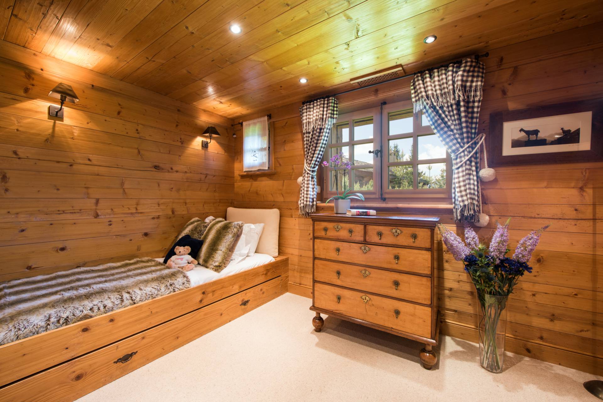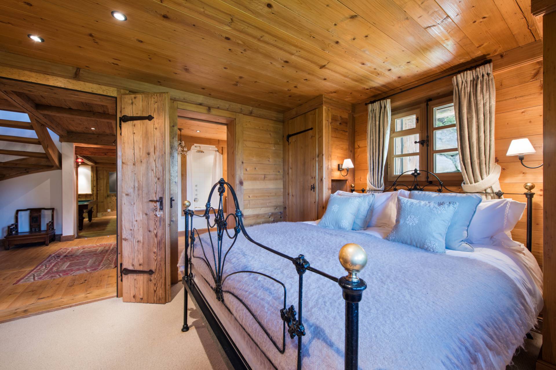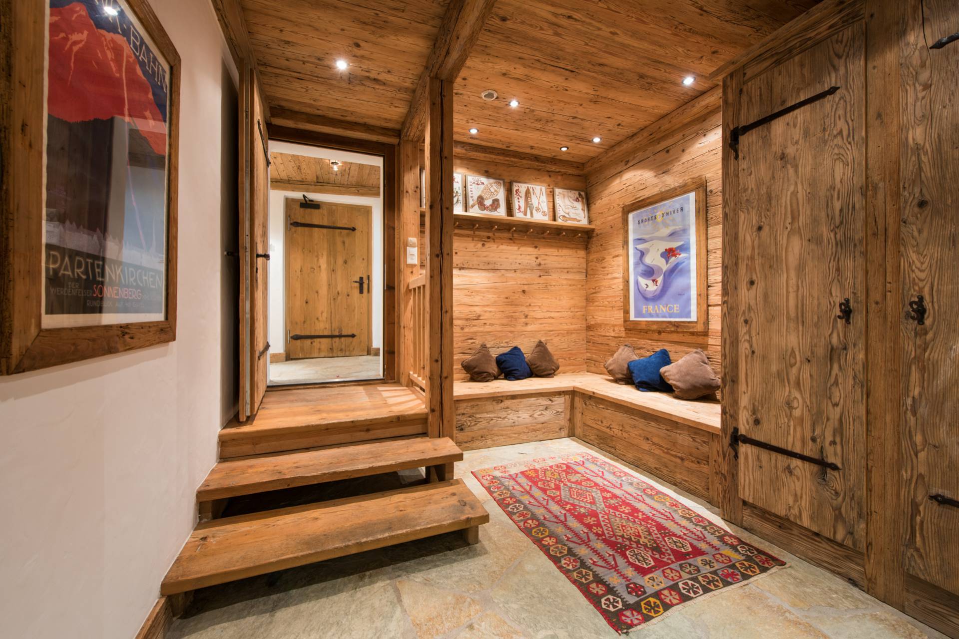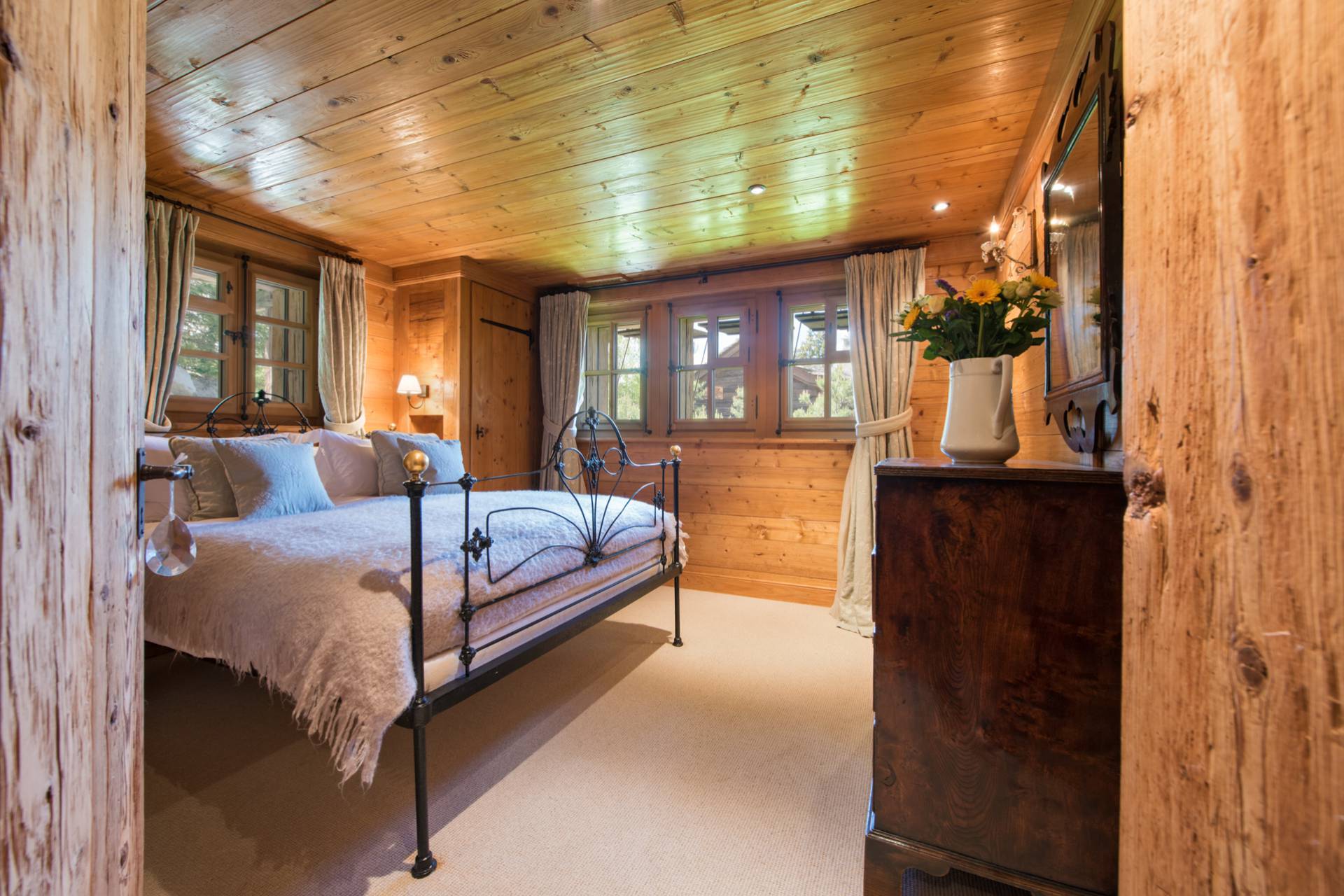 The three main bedrooms are on the first floor of the chalet. Its decoration respects alpine tradition, making you feel like you have stepped into the past. The walls with wooden cladding and stone paving dialogue in harmony with the antique furniture and wrought iron beds. The atmosphere of each of the rooms is simple and elegant. Two of them are double and equipped with king size beds with private bathrooms with foot tubs and antique faience tiles. The third is for children, with four bunk beds and an en-suite shower room. The architects were pleased to restore the house’s authentic character, multiplying the charming details, choosing finely embroidered veilings, rustic ironwork, and old engravings to decorate the walls. Perched in the mezzanine, a last room equipped with two extra beds can also accommodate two other people who can then enjoy the independent bathroom on the ground floor.