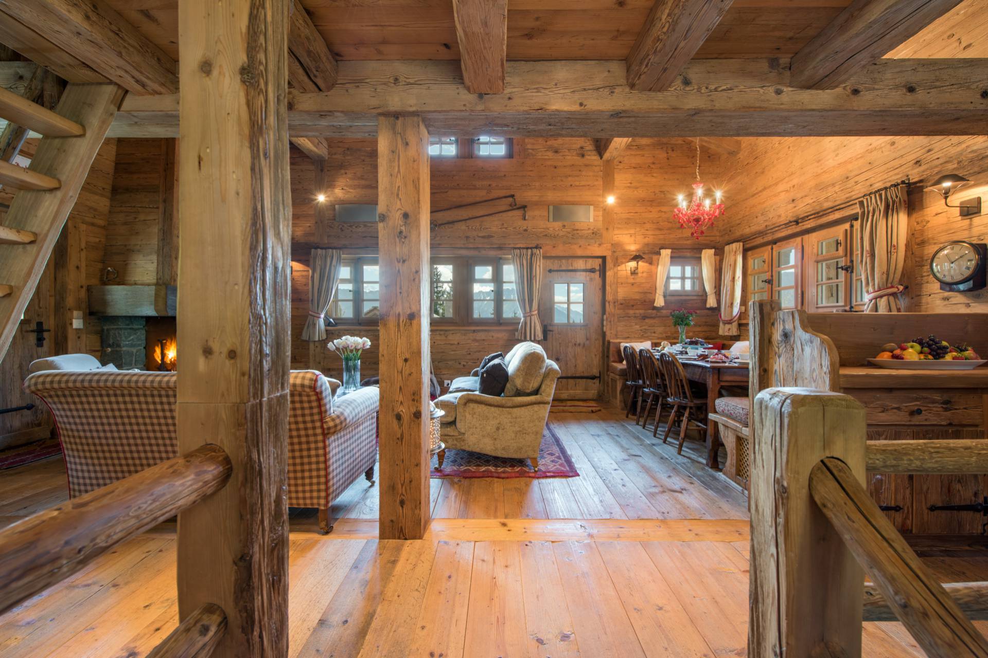 On the 1st floor, you will discover the living room opens up onto the dining room and the kitchen, with an impregnable view of the Mont Blanc which dominates the station. The entire room is adorned with raw wood, in a warm country atmosphere. The timber veins and exposed beams, the staircase and the massive ladder leading to the mezzanine recall the typical architecture of the Swiss chalets. At the corner of the large stone fireplace, armchairs and sofas with red and white fabric brighten and warm the atmosphere.