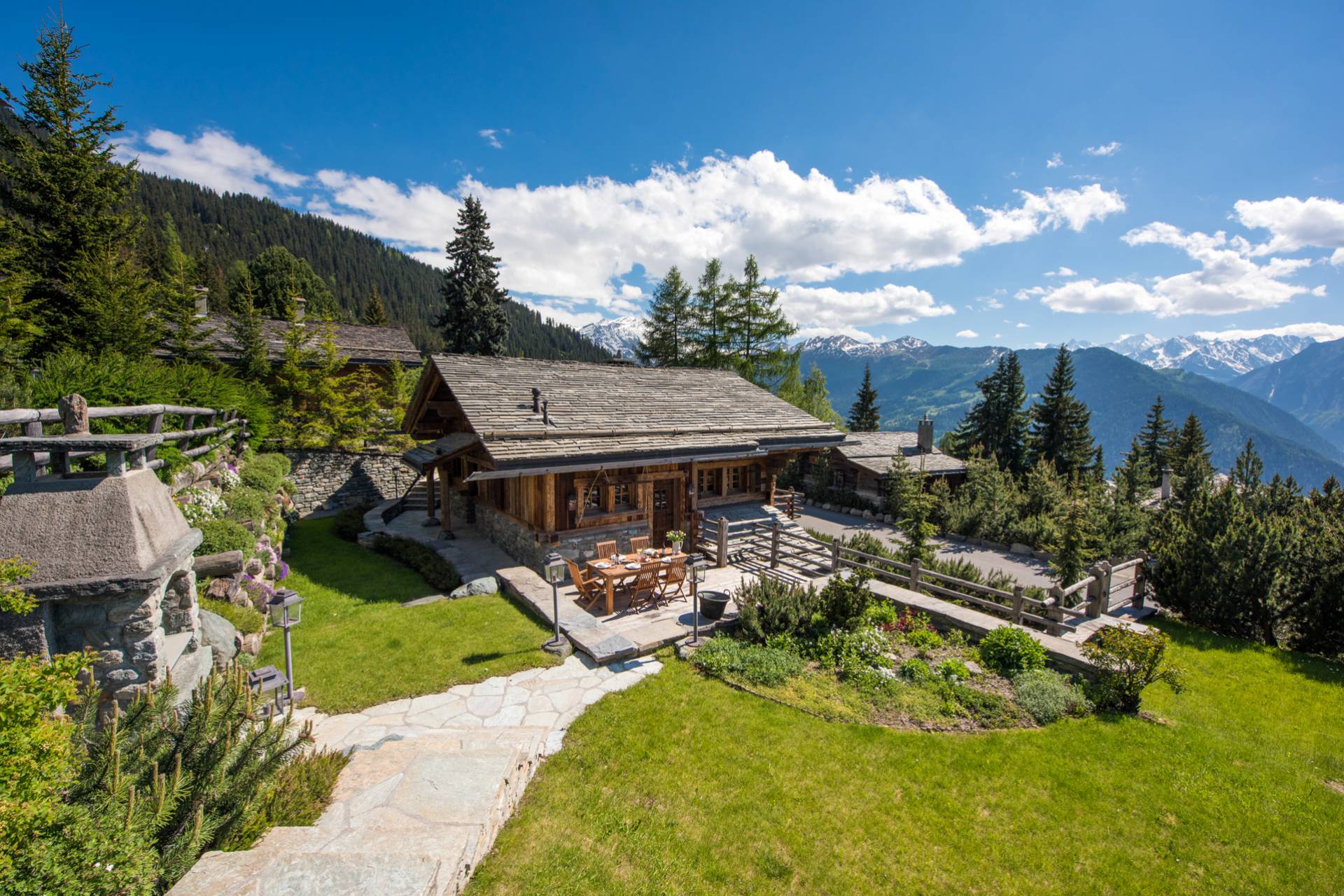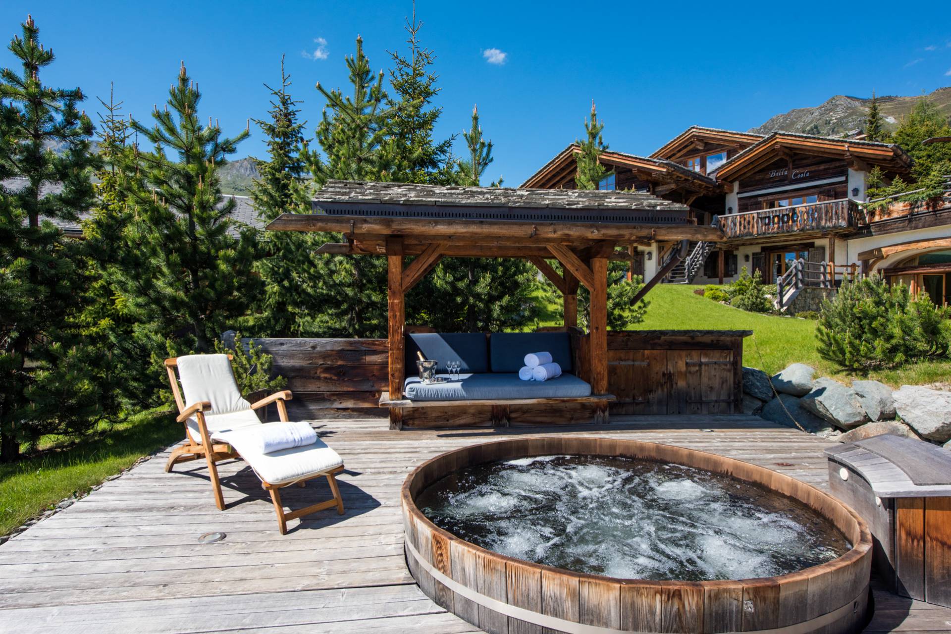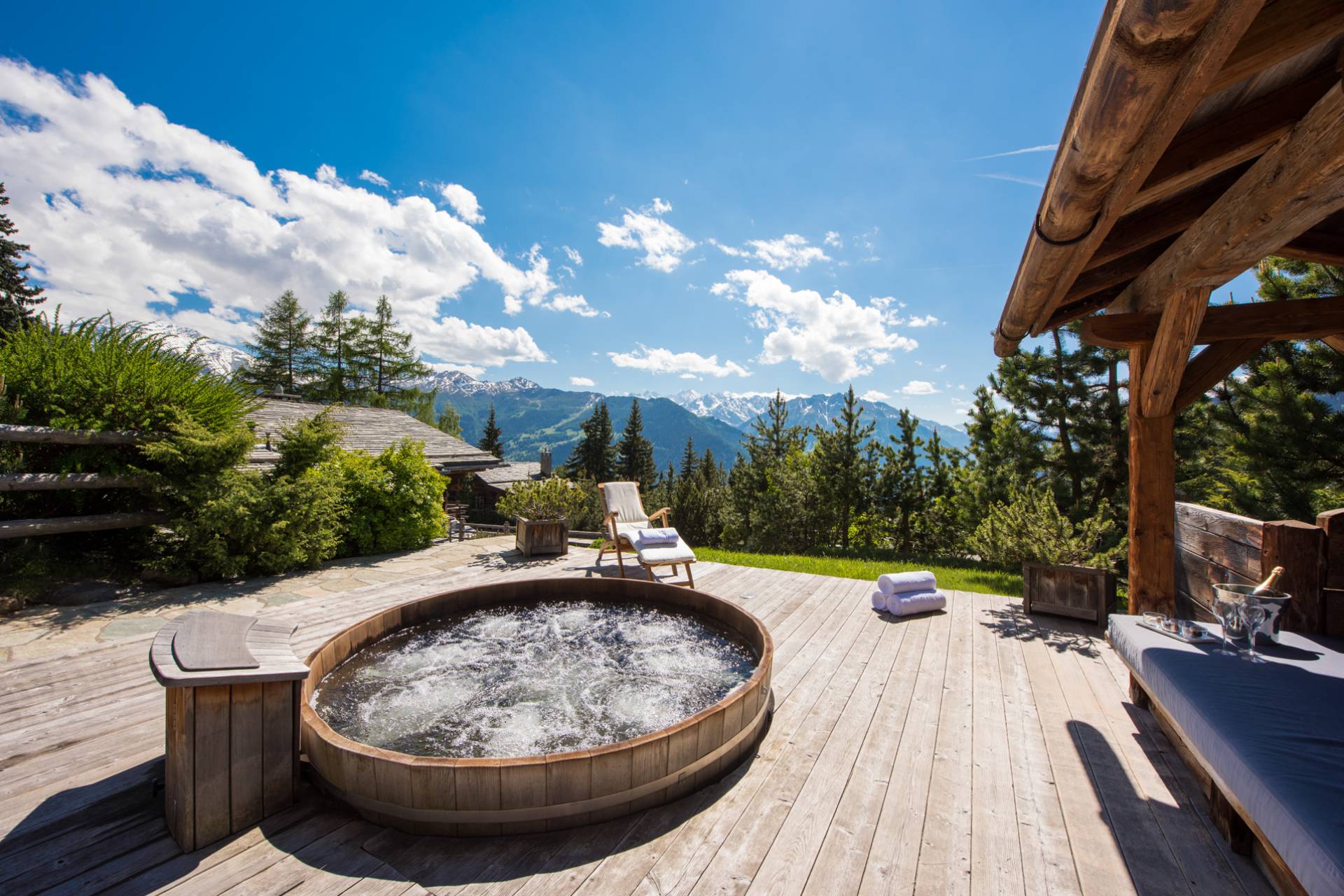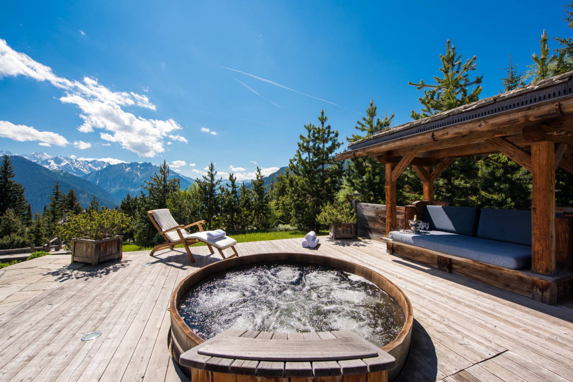 In the heights of Verbier, less than a kilometer from the 4 Valleys resort and ski lifts, this chic, country style chalet is an ideal retreat for a small family or group of friends. With a capacity of six to eight people, its 300 m2 are spread over three floors, including a charming mezzanine. Outside, the terrace is endowed with a sumptuous jacuzzi from where you can admire the dazzling panorama of the Swiss Alps.