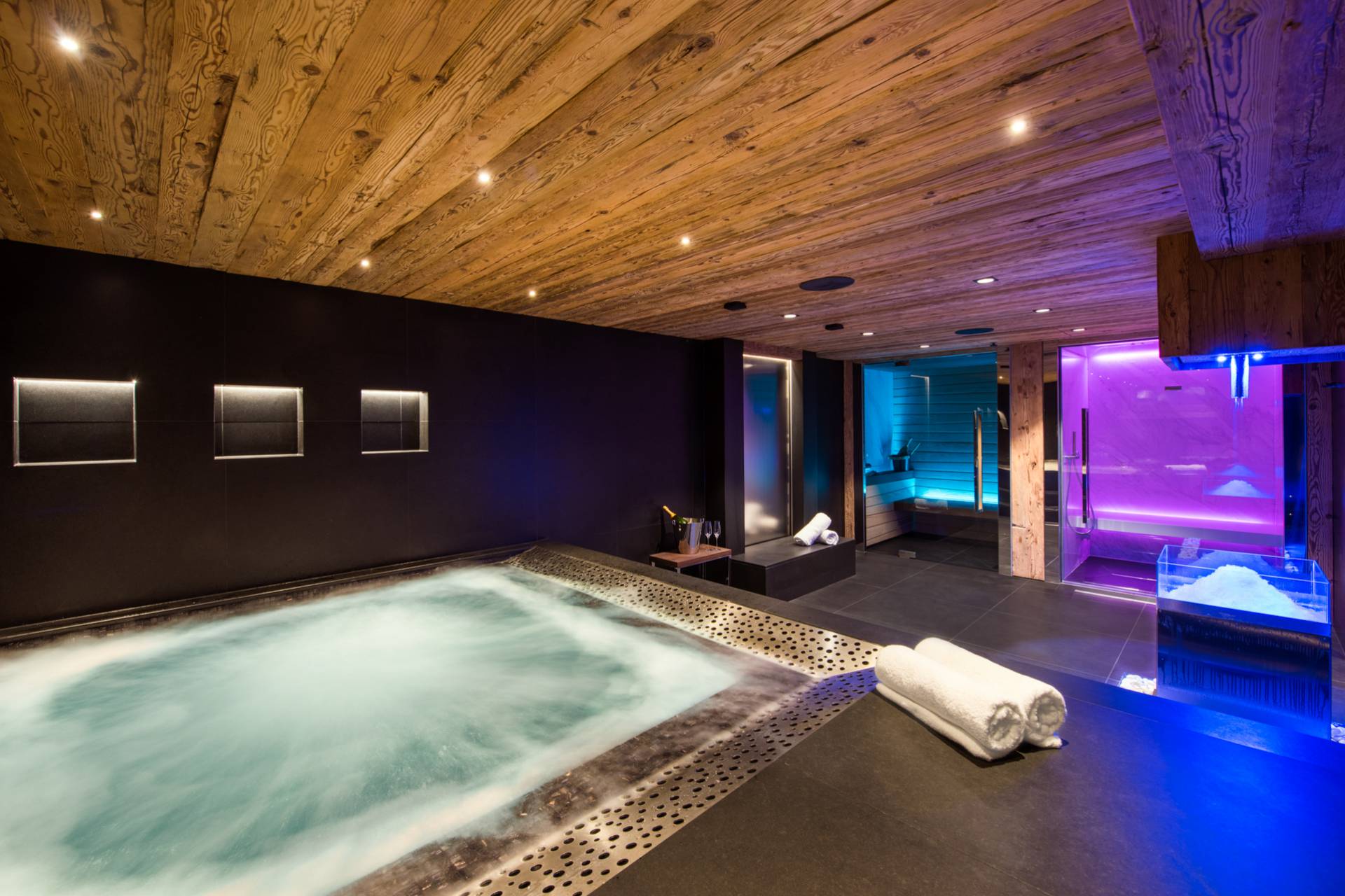 But it is undoubtedly the floor dedicated solely to your well-being that makes this chalet an incomparable place. In the basement, you will have all the leisure to enjoy a luxurious spa with swimming pool, hammam, sauna, jacuzzi, massage room, and gym, sublimated by polychrome lighting.