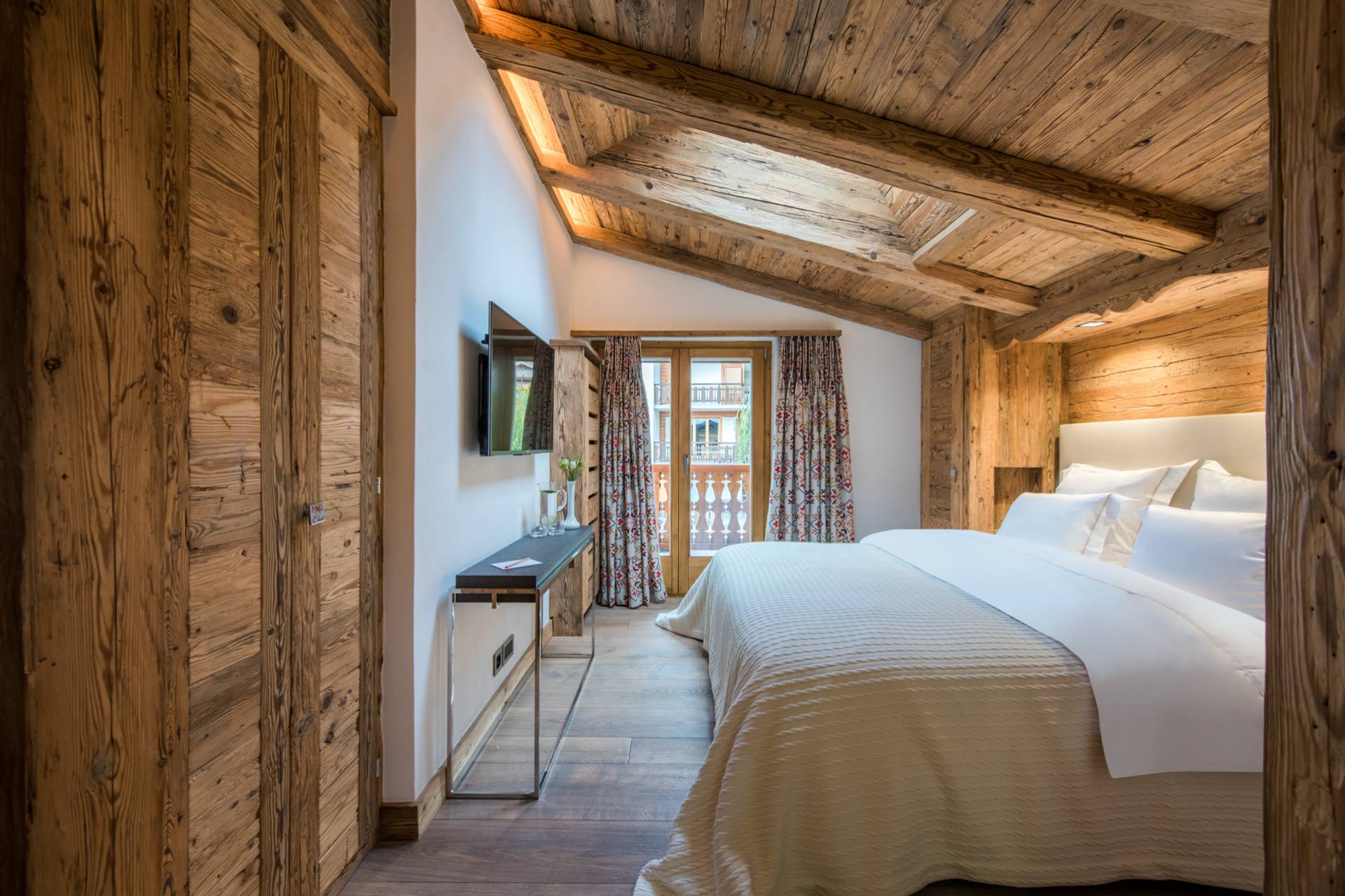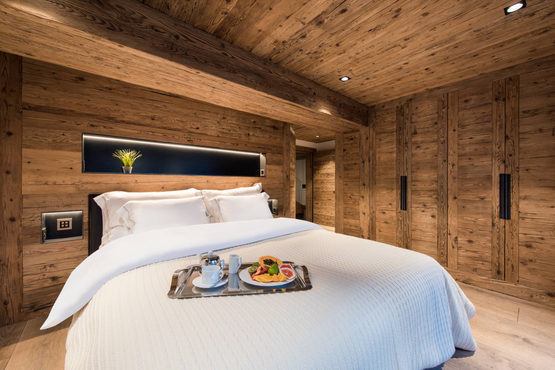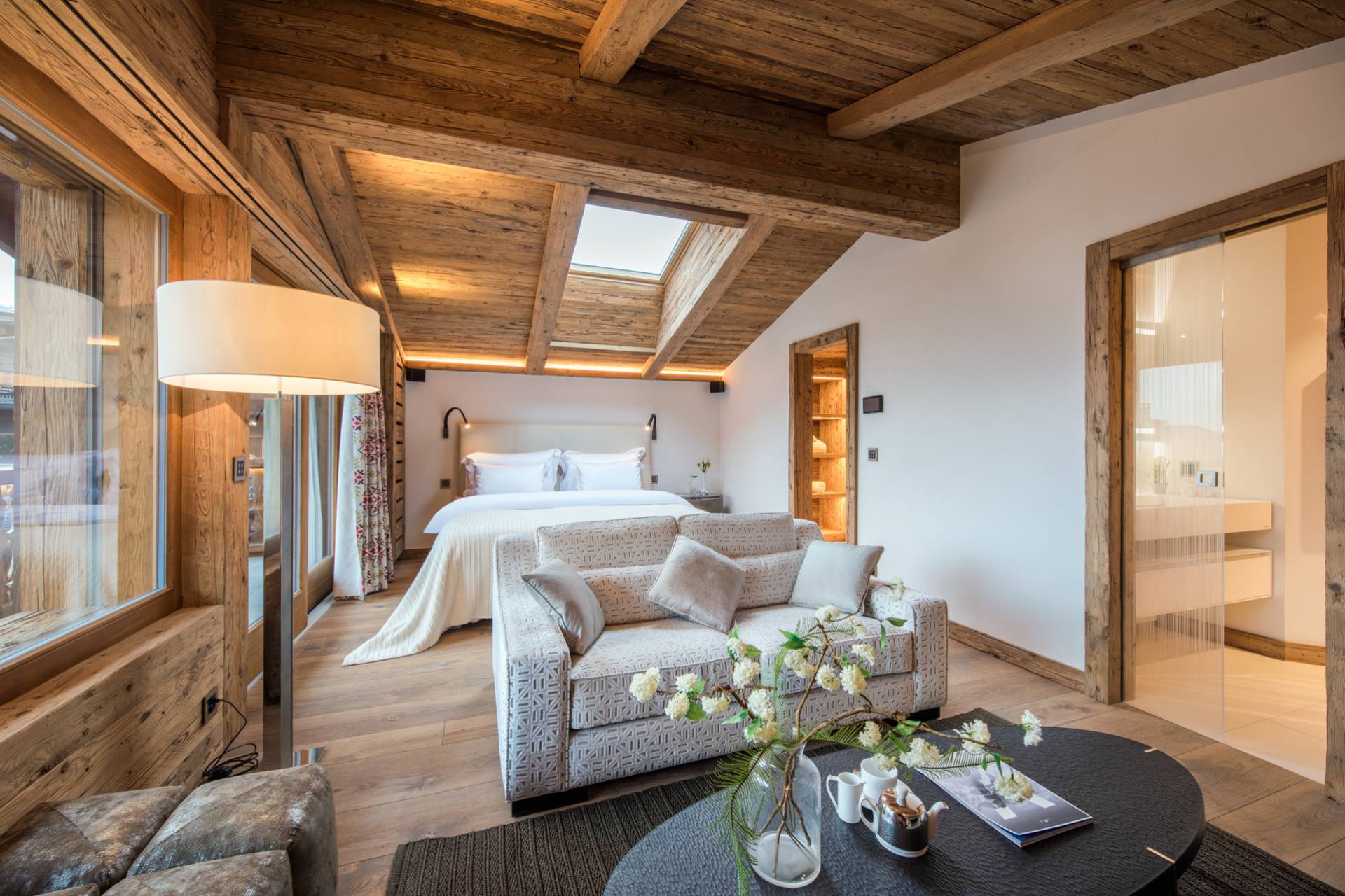 Finally, three double rooms share the top floor, featuring the superb master suite, a modest studio for a couple of lovers under a solid wood frame, with a king size bed, a lounge area near the fireplace, and a private bathroom with a sophisticated multi-jet bathtub. The other two double rooms also offer top-of-the-line comfort in a setting that does not sacrifice any of the traditional alpine charm, while benefiting from the magnificent adjoining bathrooms entirely adorned in raw black slate.