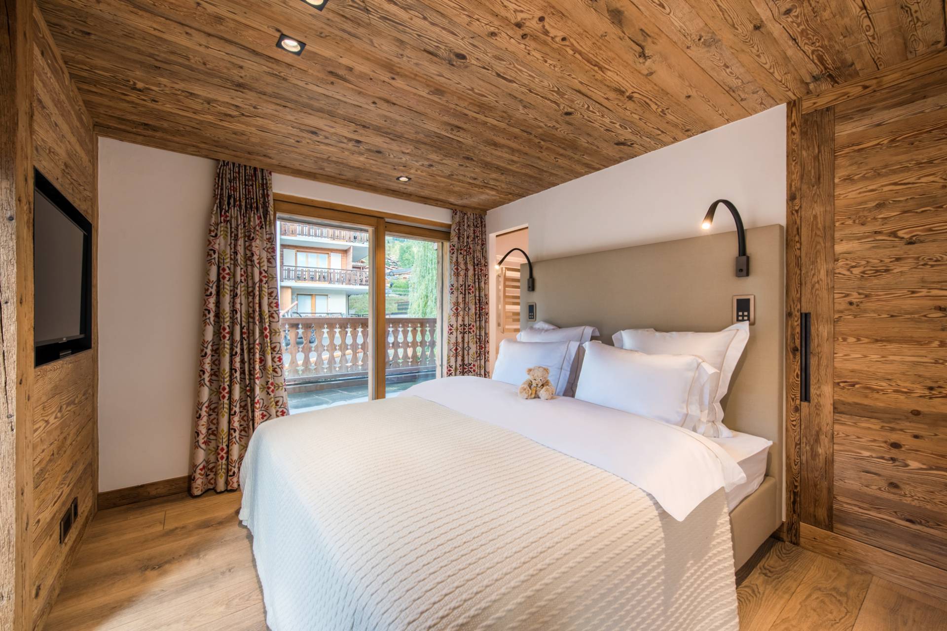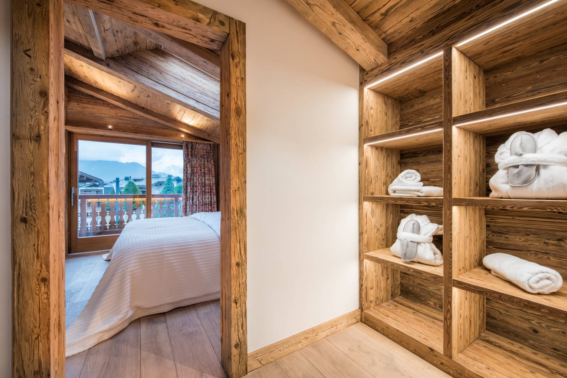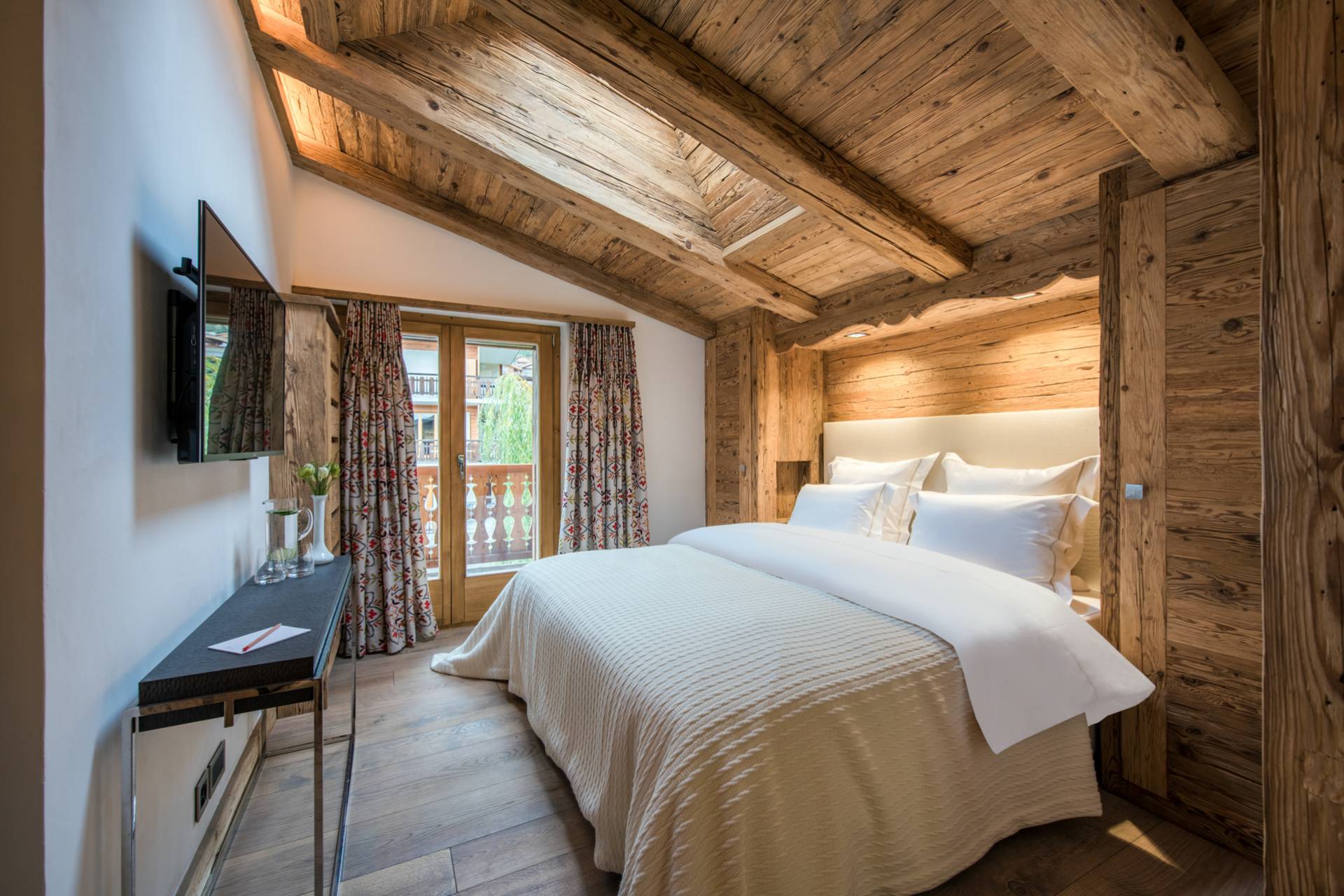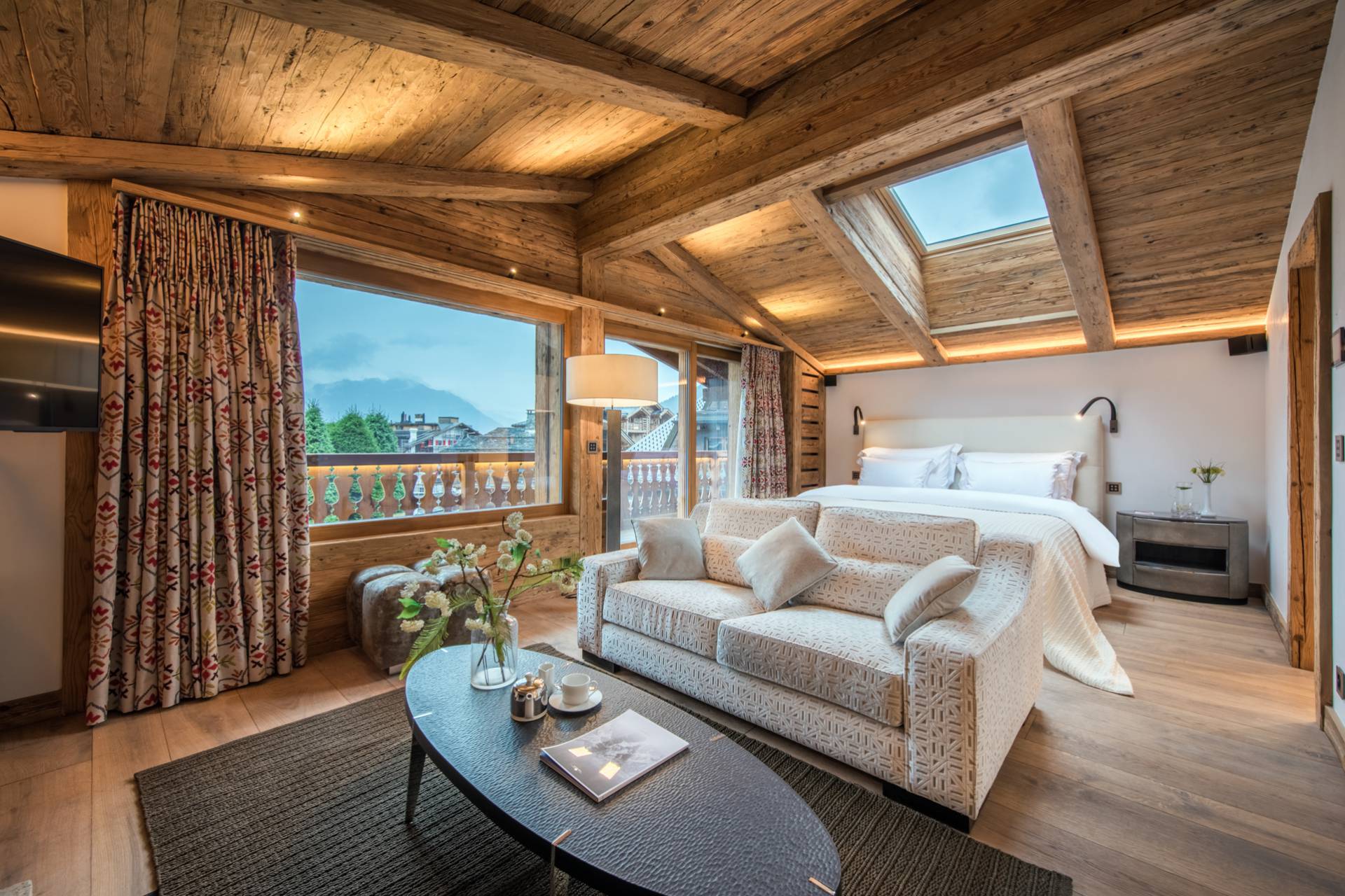 Finally, three double rooms share the top floor, featuring the superb master suite, a modest studio for a couple of lovers under a solid wood frame, with a king size bed, a lounge area near the fireplace, and a private bathroom with a sophisticated multi-jet bathtub. The other two double rooms also offer top-of-the-line comfort in a setting that does not sacrifice any of the traditional alpine charm, while benefiting from the magnificent adjoining bathrooms entirely adorned in raw black slate.