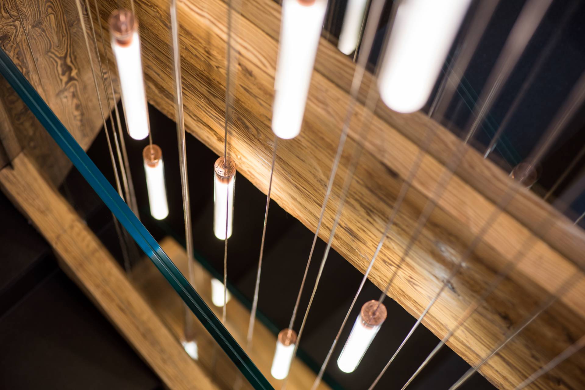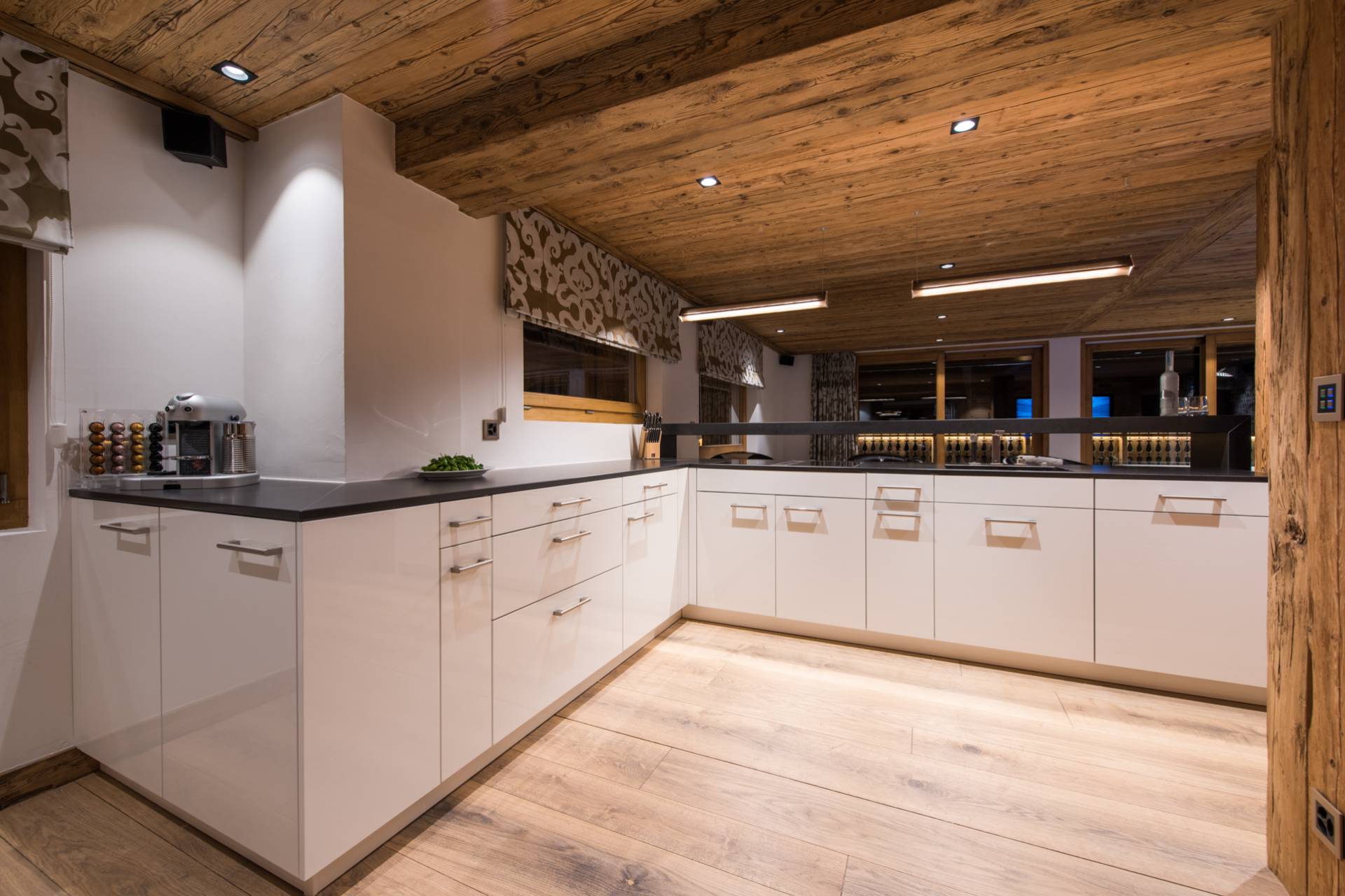 A large wood and glass staircase will lead you to the first floor and the huge modern lounge. You will enjoy lying on the large angled sofa, watching a movie on the beautiful plasma TV screen, or simply relaxing in the second small lounge area, furnished with sleek armchairs in soft grey tones. The wood-trimmed walls and parquet floor will remind you of the atmosphere of traditional chalets, counterbalanced by the elegant lines of the ultra-contemporary furniture and lighting.