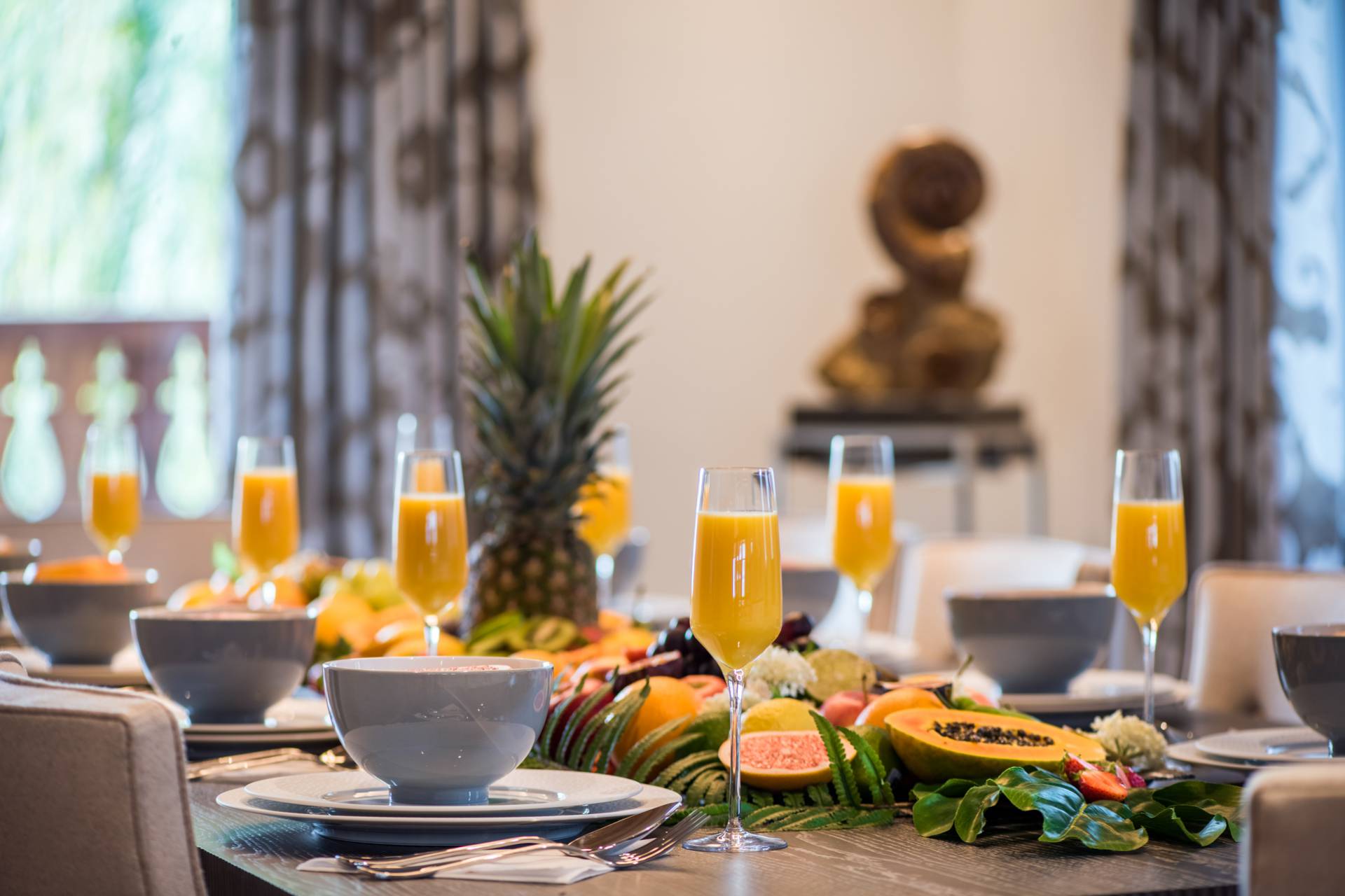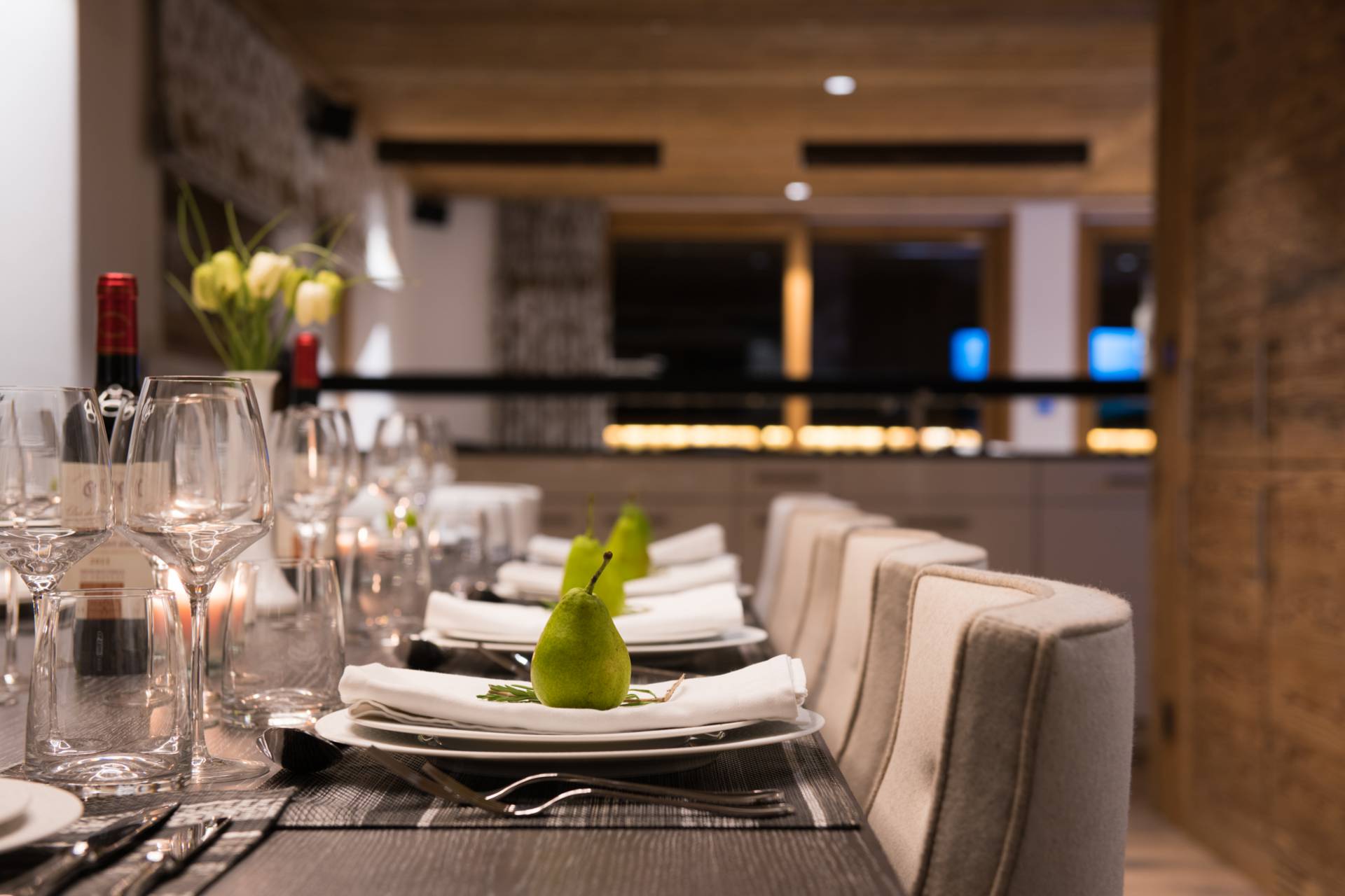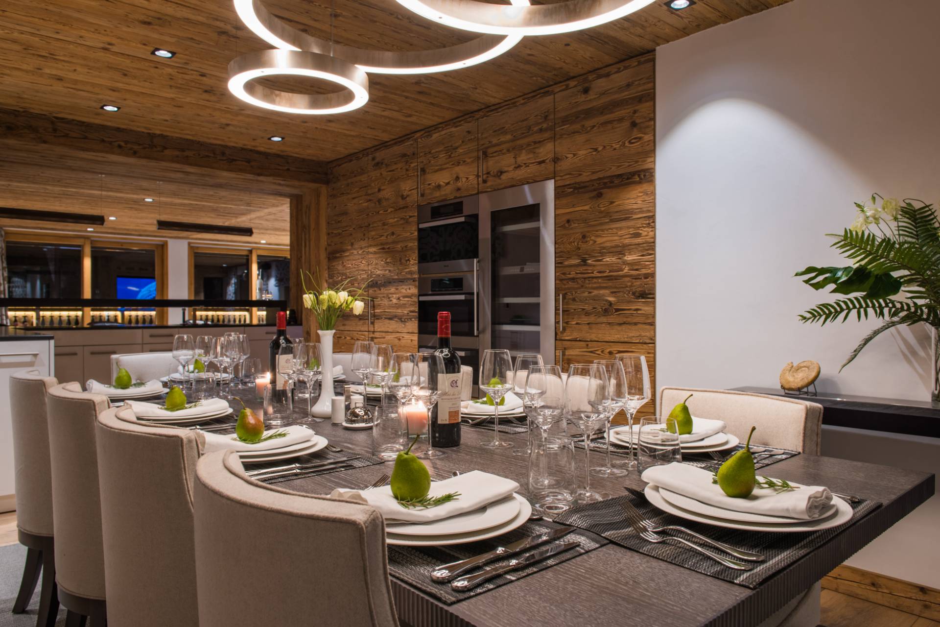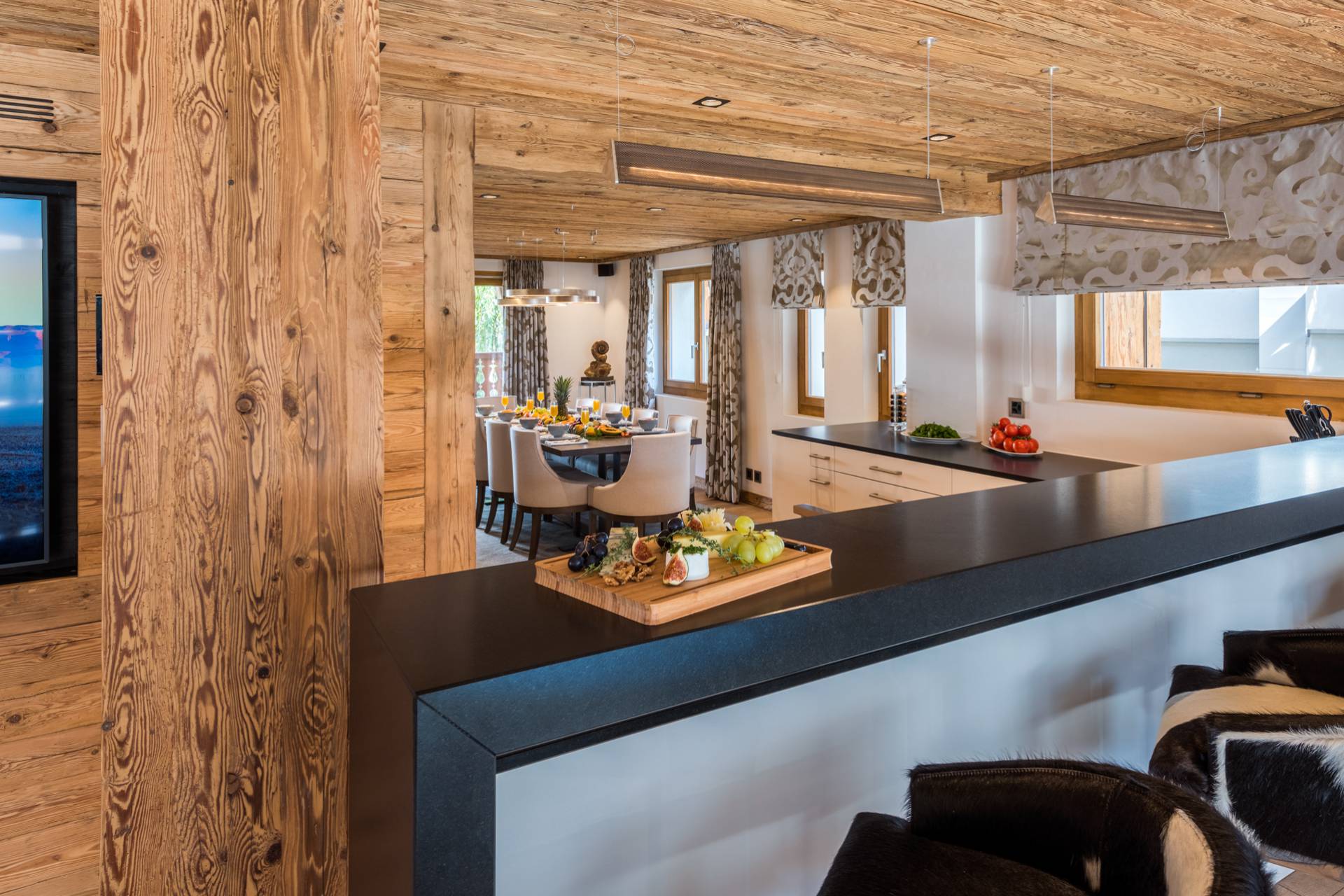 In the dining room, the table accommodates up to ten guests who will share the delicious meals prepared by the experienced team leader throughout your stay. You may choose to grab a quick bite from the friendly open-plan kitchen that flows into the living room, perched on the bar stools. Another couple can also stay on the first floor in a perfectly equipped double room with private balcony (its remarkable outdoor spaces are just one of many advantages of this luxury chalet).